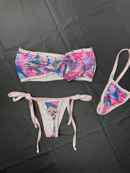 Butterfly Print Spandex Tube Top/Side-Tie Bikini Bottoms Two-Piece Lingerie Outfit
