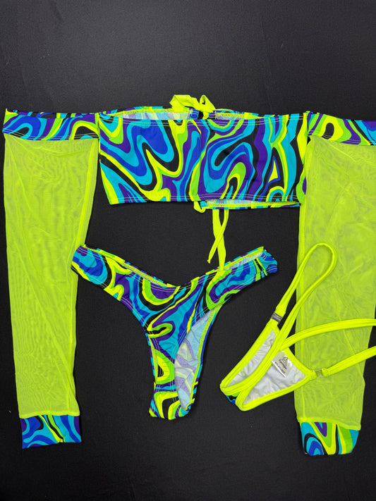Cosmic Blue/Neon Yellow Long Sleeve Tube Top/Cheeky Thong Two-Piece Lingerie Outfit