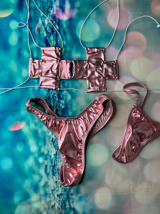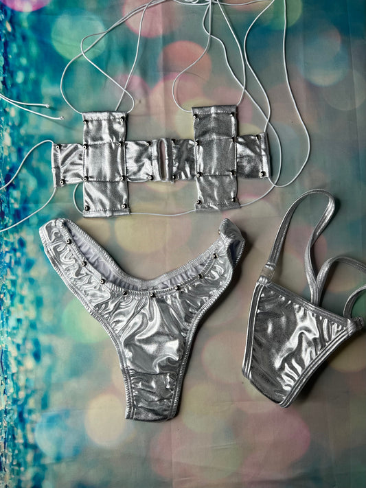 Exotic Dance Wear Chrome Two-Piece Outfit for Strippers
