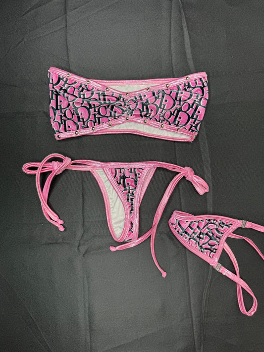 Hot Pink Designer/Black Spandex Two-Piece Side-Tie Bikini Lingerie Outfit