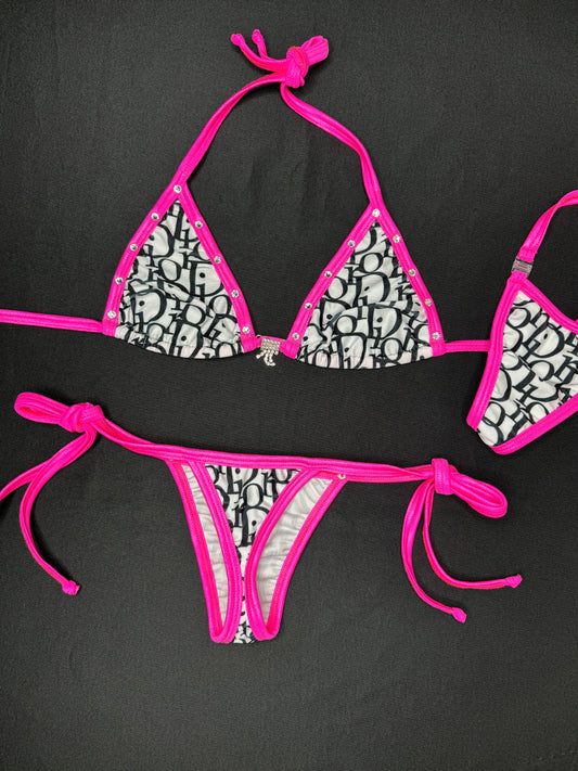 Hot Pink/White Designer Two-Piece Side-Tie Bikini Lingerie Outfit