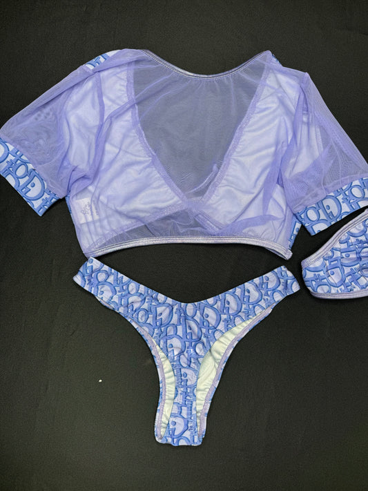 Lavender Designer Spandex/Lavender Mesh Two-Piece Cheeky Thong Lingerie Outfit