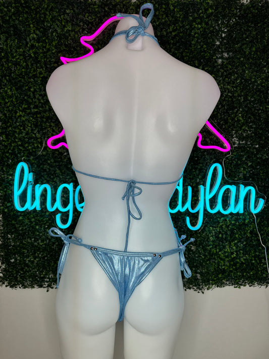 Metallic Baby Blue Two-Piece Side-Tie Bikini Lingerie Outfit