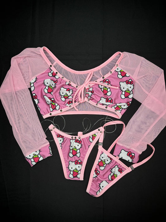 Baby Pink Mesh Strawberry Kitty Spandex Two-Piece Lingerie Outfit
