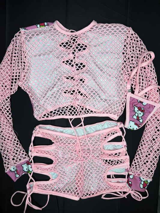 Baby Pink Kitty/Fishnet Spandex Two-Piece Lingerie Outfit