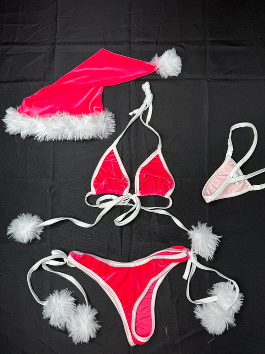 Pink Velvet/White Fur Two-Piece Side-Tie Bikini Lingerie Outfit