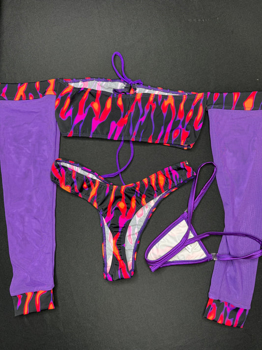 Purple Mesh/Tiger Stripe Animal Print Tube Top Long Sleeve/Cheeky Thong Two-Piece Lingerie Outfit