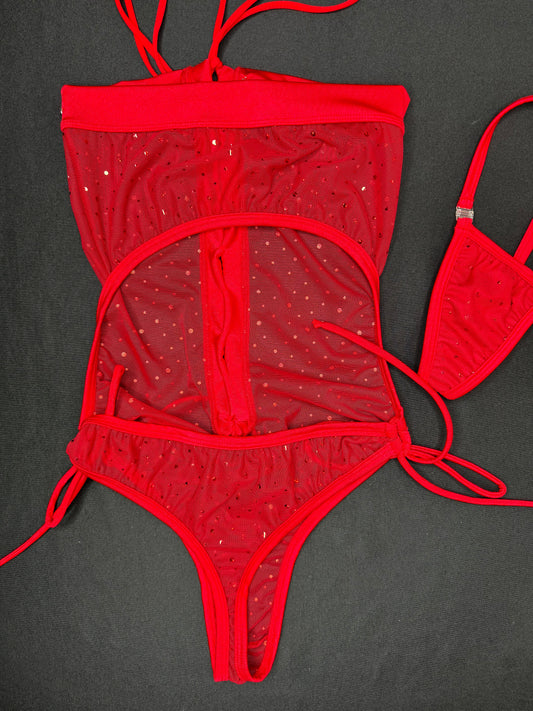 Red Sparkle Mesh One-Piece Lingerie Outfit