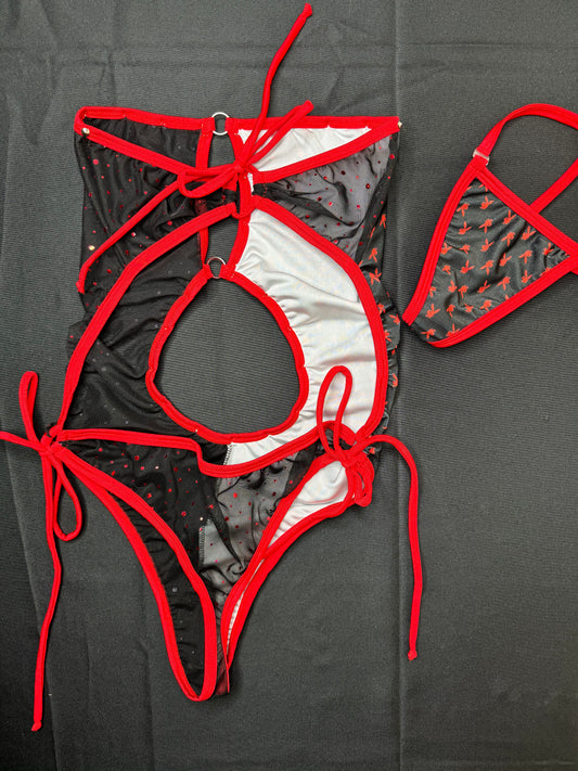 Red/Black Designer One-Piece Romper/Bikini Top Lingerie Outfit