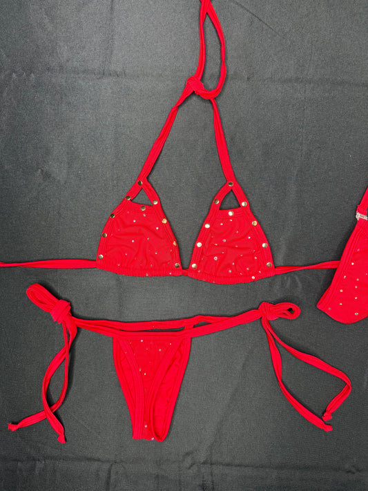 Red Metallic Dance Wear Two-Piece Bikini Top & Strap Bottoms