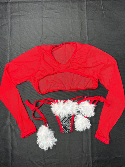 Red Mesh/White Fur & Silver Spandex Three-Piece Christmas Lingerie Outfit