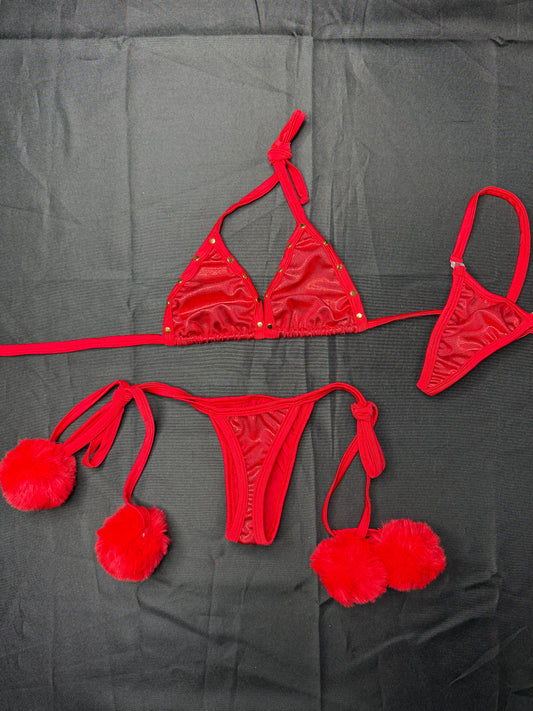 Red Metallic Spandex/Red Fur Two-Piece Bikini Lingerie Outfit