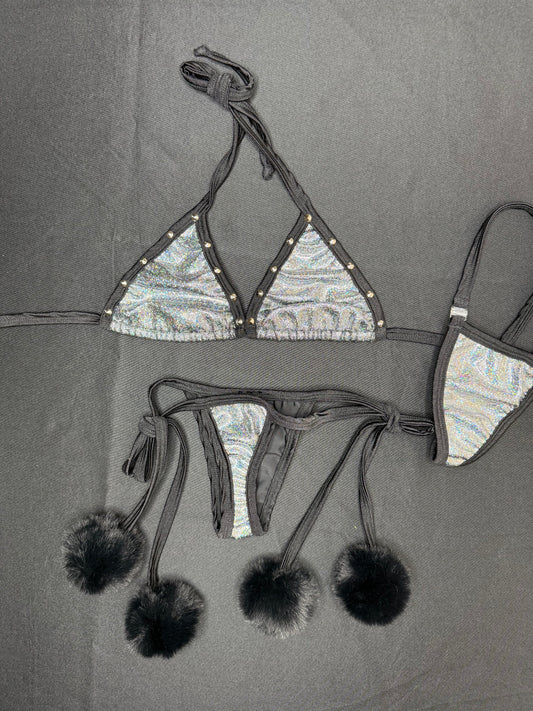Silver/Black Fur Two-Piece Bikini Lingerie Outfit