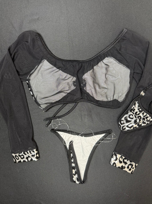 Silver Cheetah Animal Print/Black Mesh Two-Piece Long Sleeve/Bikini Bottoms Two-Piece Lingerie Outfit