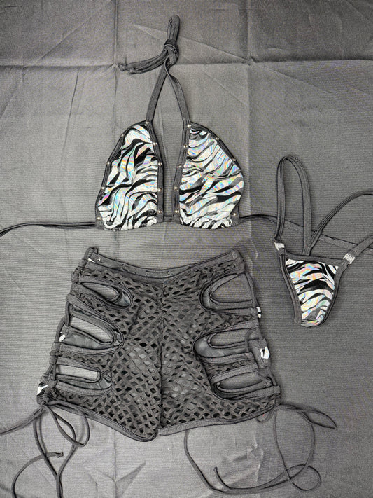 Silver/Black Tiger Stripe Animal Print Spandex Bikini Top/Shorts Two-Piece Lingerie Outfit