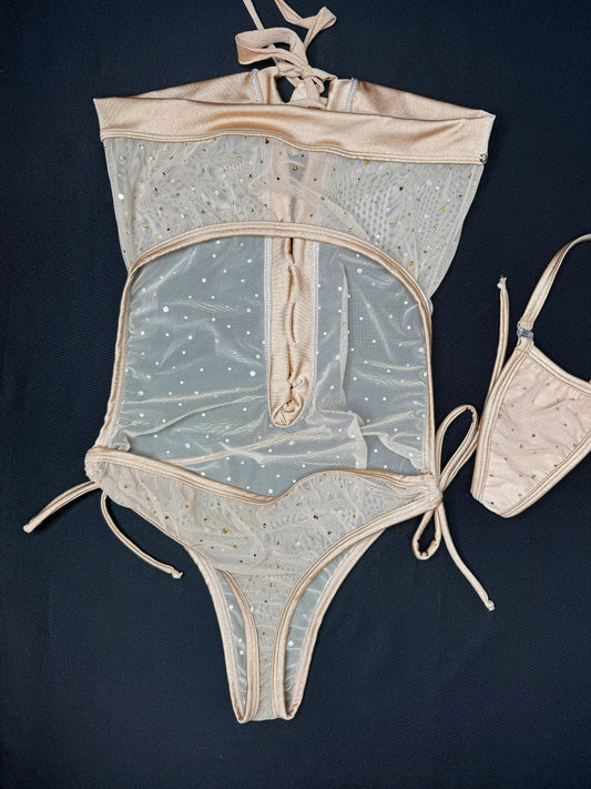 Beige/Nude Sparkle Mesh One-Piece Lingerie Outift