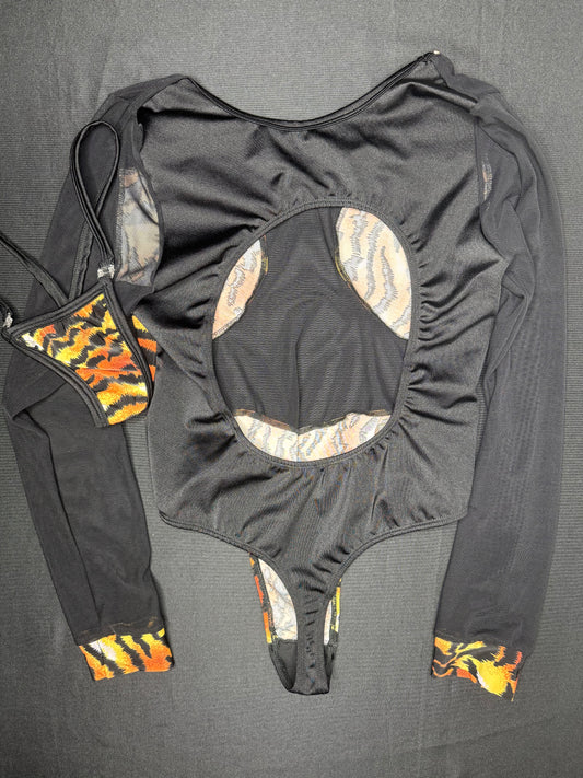 Tiger Animal Print/Black Mesh Leotard One-Piece Lingerie Outfit