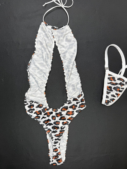 White/Brown Animal Print One-Piece Lingerie Outfit