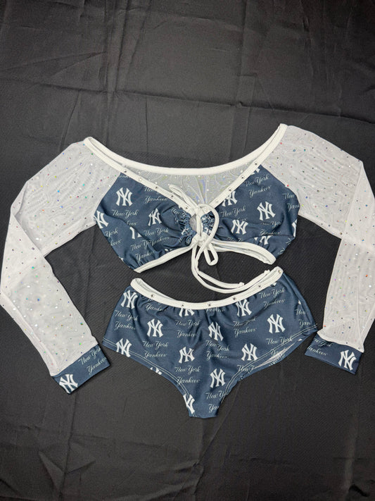 Yankees Blue Spandex/White Mesh Long Sleeve/Shorts Two-Piece Lingerie Outfit