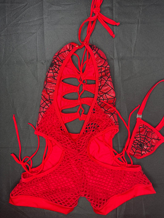 Red Spandex Spider Web One-Piece Romper Lingerie Outfit