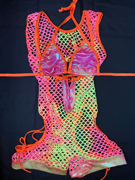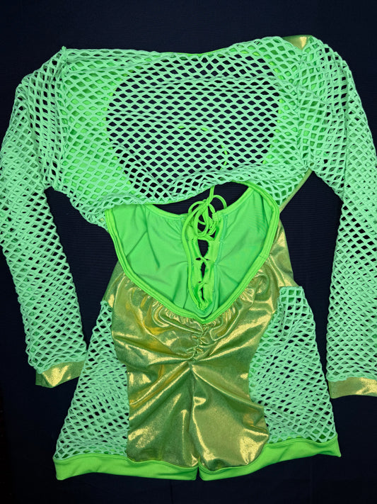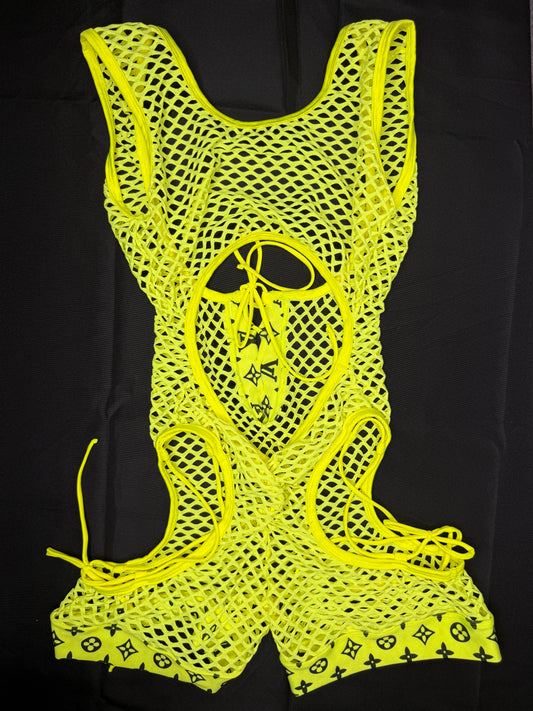 Neon Yellow Designer Spandex Fishnet Romper/Bikini Top One-Piece Lingerie Outfit