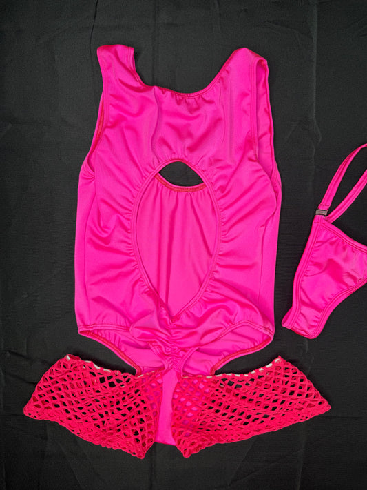 Hot Pink Spandex/Fishnet One-Piece Romper Lingerie Outfit