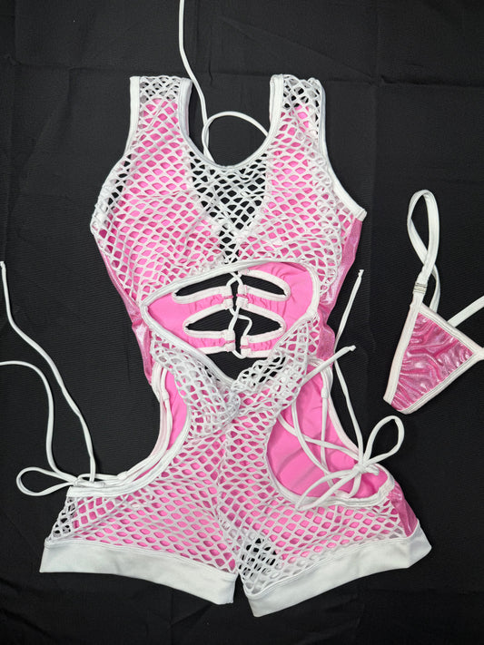 Hot Pink Metallic Spandex/Baby Pink Fishnet Romper Lingerie Outfit