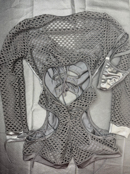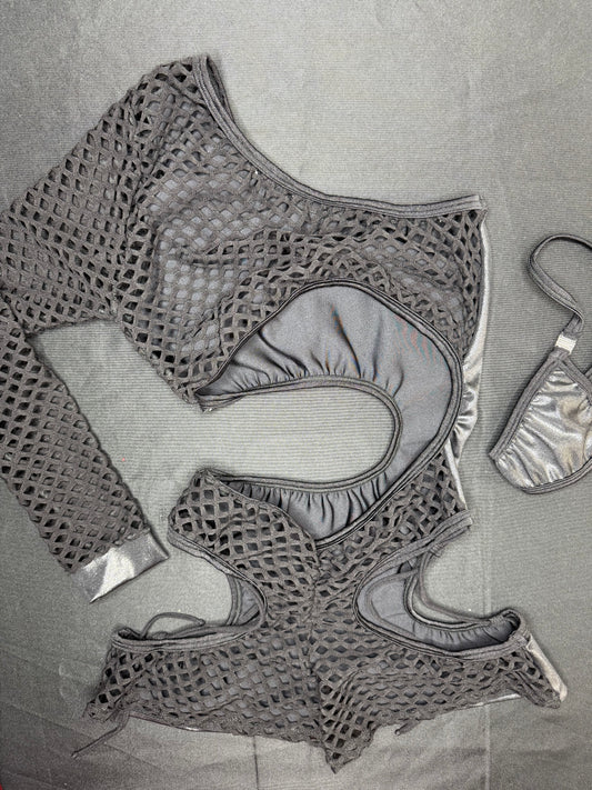 Metallic Black Spandex/Fishnet Single Sleeve One-Piece Romper Lingerie Outfit