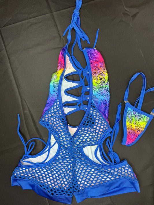Royal Blue Fishnet Rainbow Animal Print Spandex One-Piece Romper Lingerie Outfit
