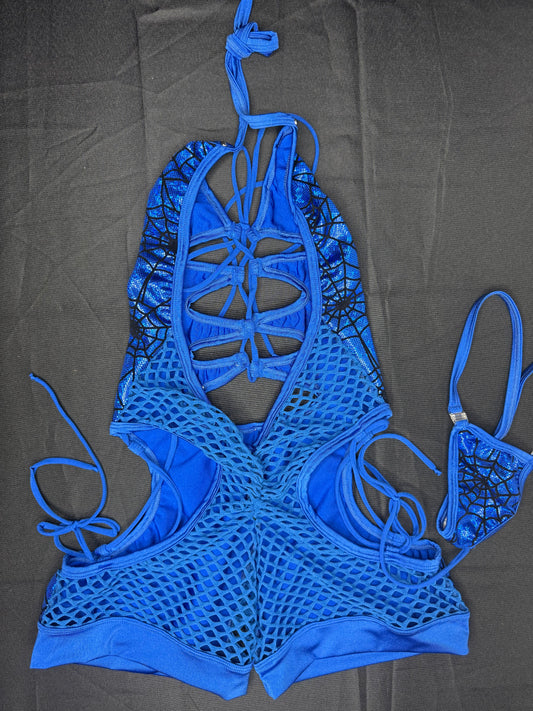 Royal Blue Spandex Spider Web One-Piece Romper Lingerie Outfit