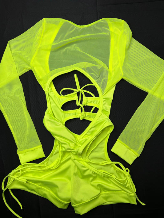 One-Piece Neon Yellow Stretch Fabric/Mesh Romper Stripper Outfit