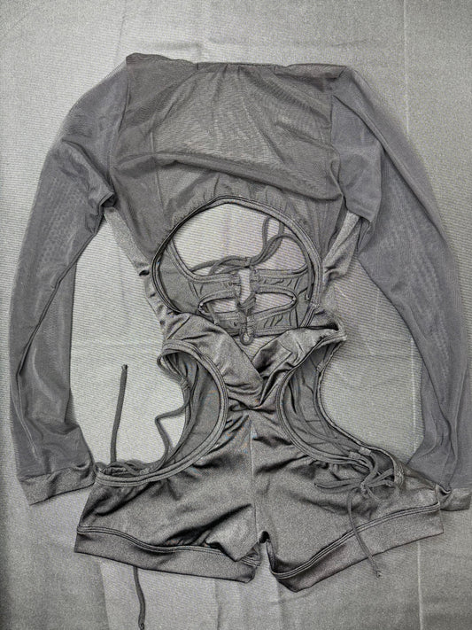 Sensual Black Stretch Fabric & Long Sleeve Mesh One-Piece Outfit