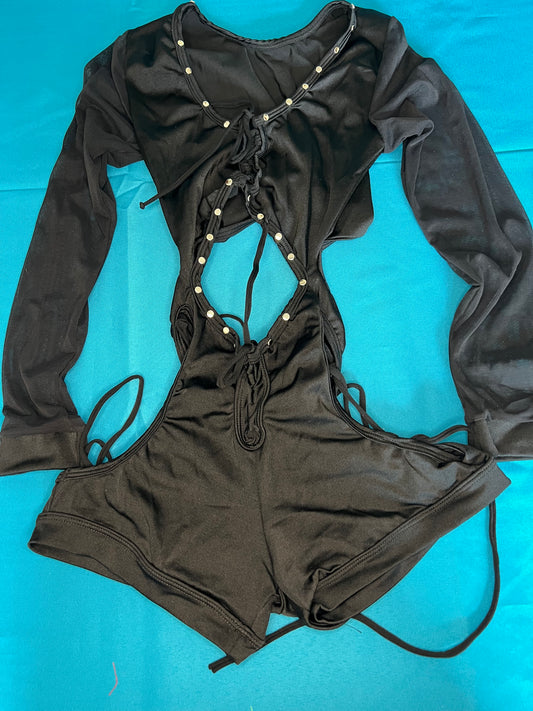 Black Long-Sleeve Mesh Bikini One-Piece Romper Outfit