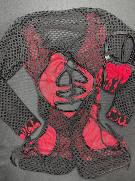 Red Glitter Mesh Flame Black Fishnet One-Piece Romper Lingerie Outfit