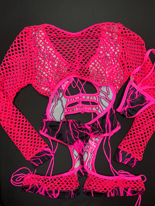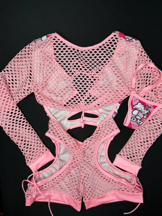 Pink Flame Mesh/Black Fishnet Long Sleeve Romper Lingerie Outfit