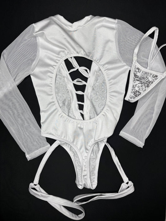 White Bandana Spandex/Mesh Garter One-Piece Leotard Lingerie Outfit