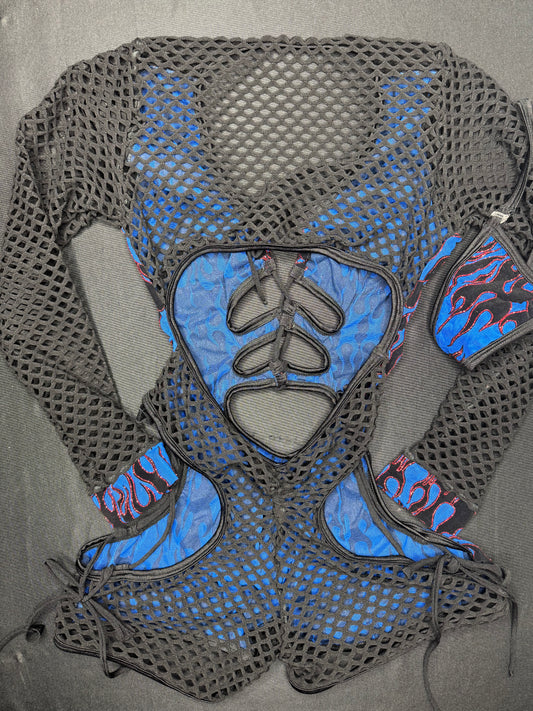 Blue Flame Mesh/Black Fishnet Long Sleeve Romper Lingerie Outfit