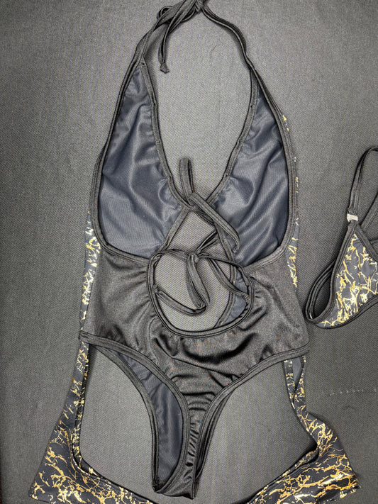 Gold/Black Spandex One-Piece Garter Leotard Lingerie Outfit