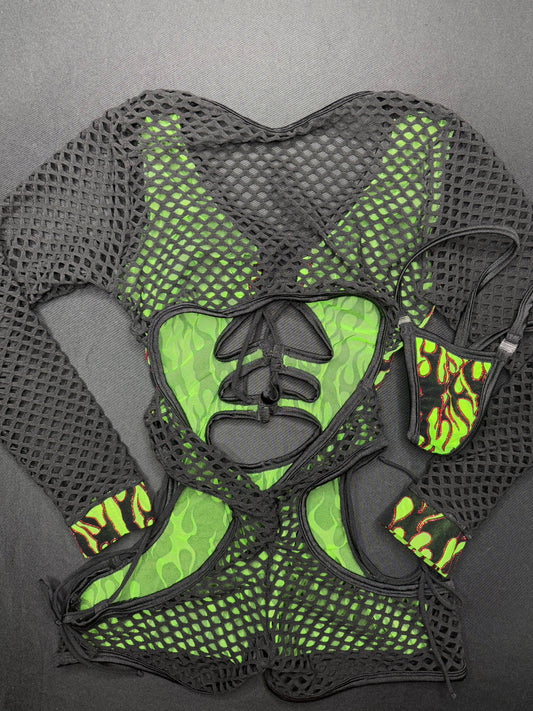 Green Mesh/Black Flame Fishnet One-Piece Romper Lingerie Outfit