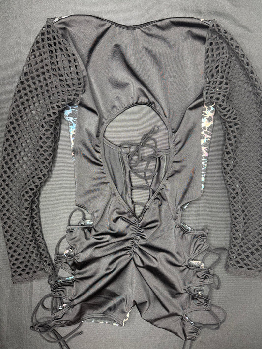 Metallic Black/Black Mesh One-Piece Leotard Lingerie Outfit