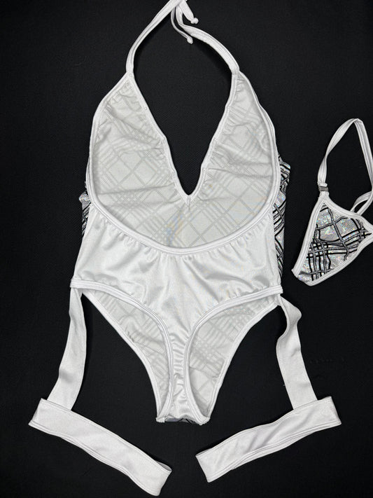 White/Silver Plaid Spandex One-Piece Leotard Garter Lingerie Outfit