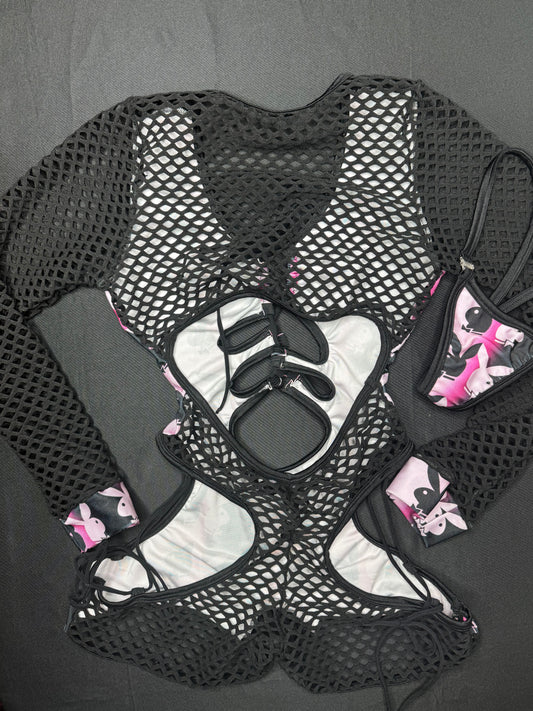 Black Fishnet/Bunny Print Spandex One-Piece Romper Lingerie Outfit