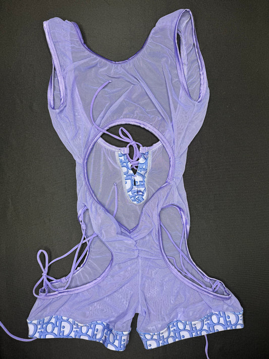 Lavender Designer Spandex/Mesh One-Piece Sleeveless Romper/Bikini Top Lingerie Outfit