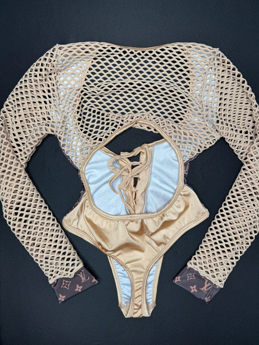 Brown Designer Fabric/Gold Fishnet One-Piece Leotard Lingerie Outfit