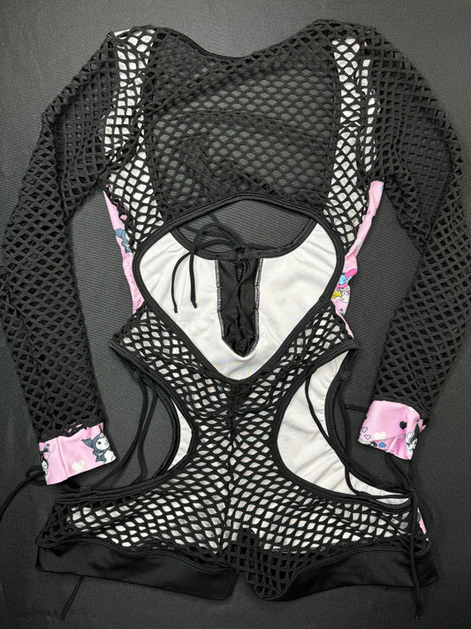 Black/Baby Pink Kuromi One-Piece Fishnet Romper Lingerie Outfit