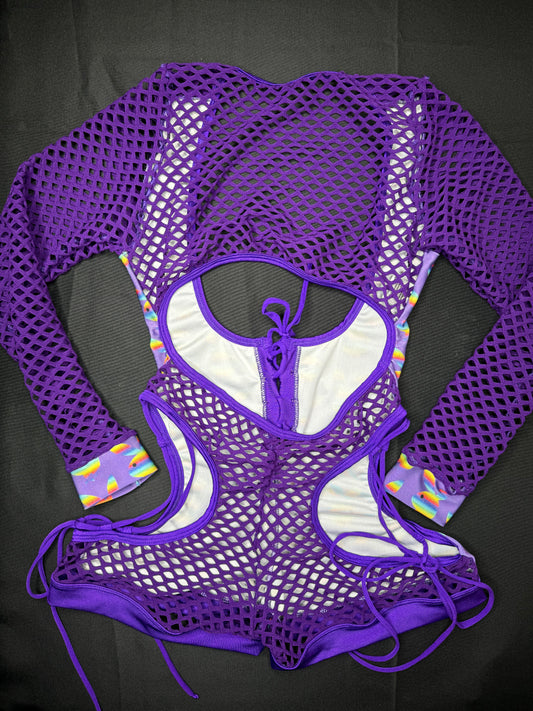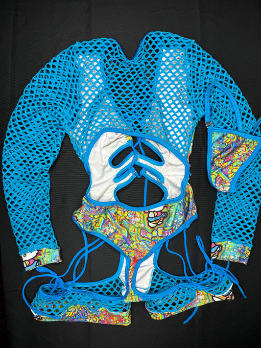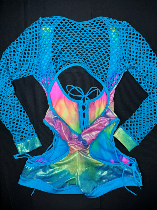Rainbow/Turquoise Fishnet One-Piece Romper Lingerie Outfit
