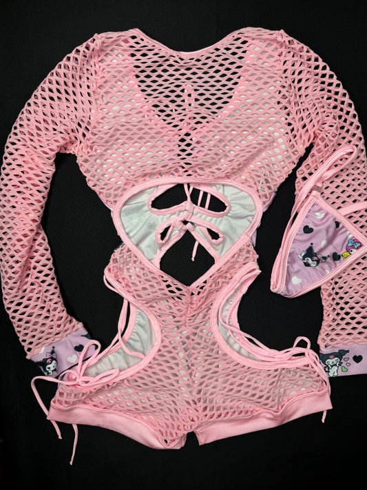 Baby Pink Kuromi One-Piece Fishnet Romper Lingerie Outfit