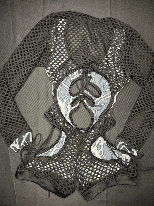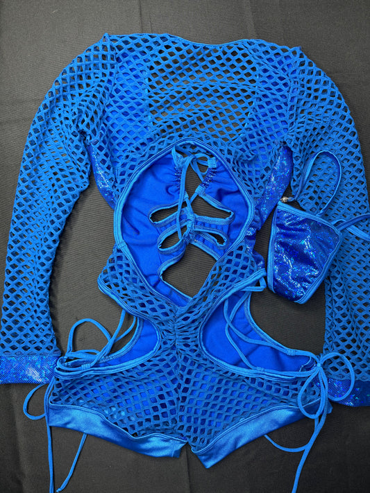 Blue Lightning/Black Fishnet One-Piece Bartender Romper Outfit