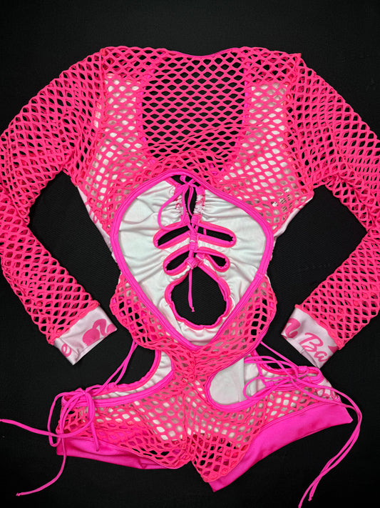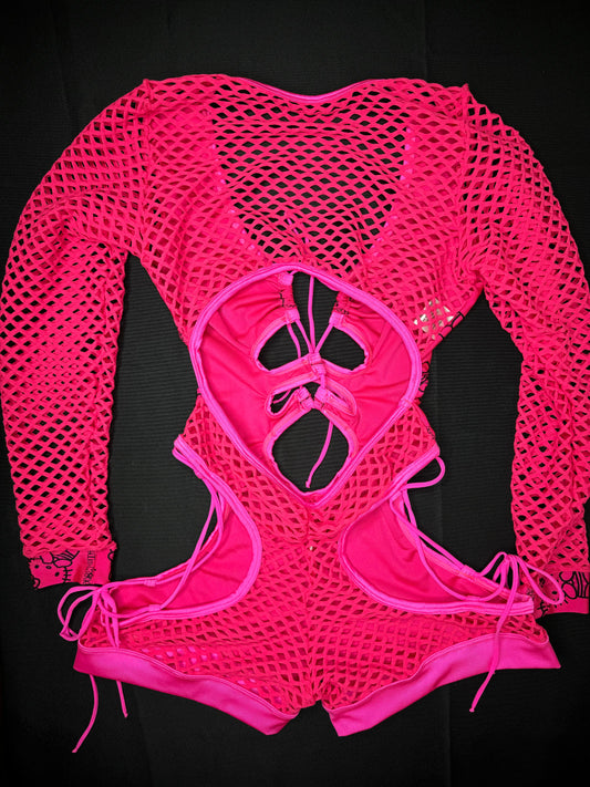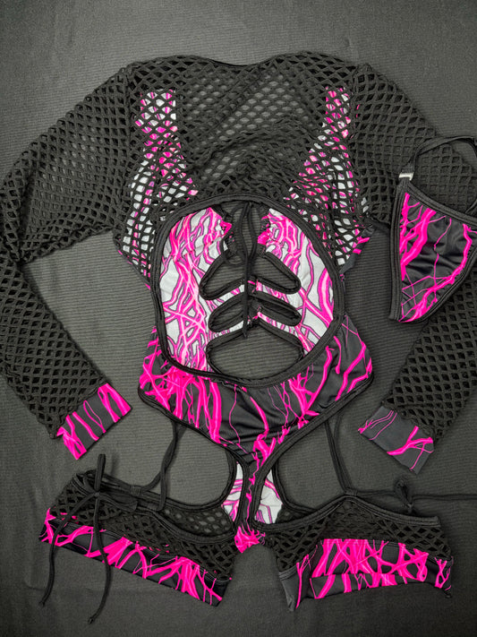 Hot Pink Thunder/Black Fishnet One-Piece Lingerie Outfit