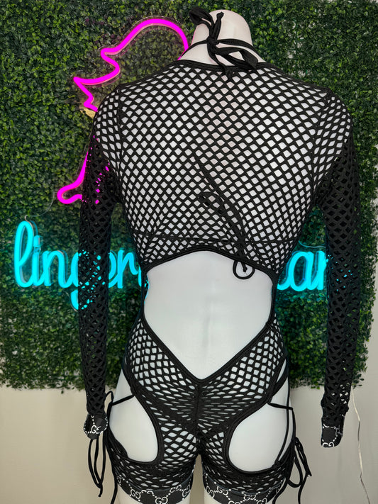 Grey Print/Black Fishnet Bartender Romper Outfit